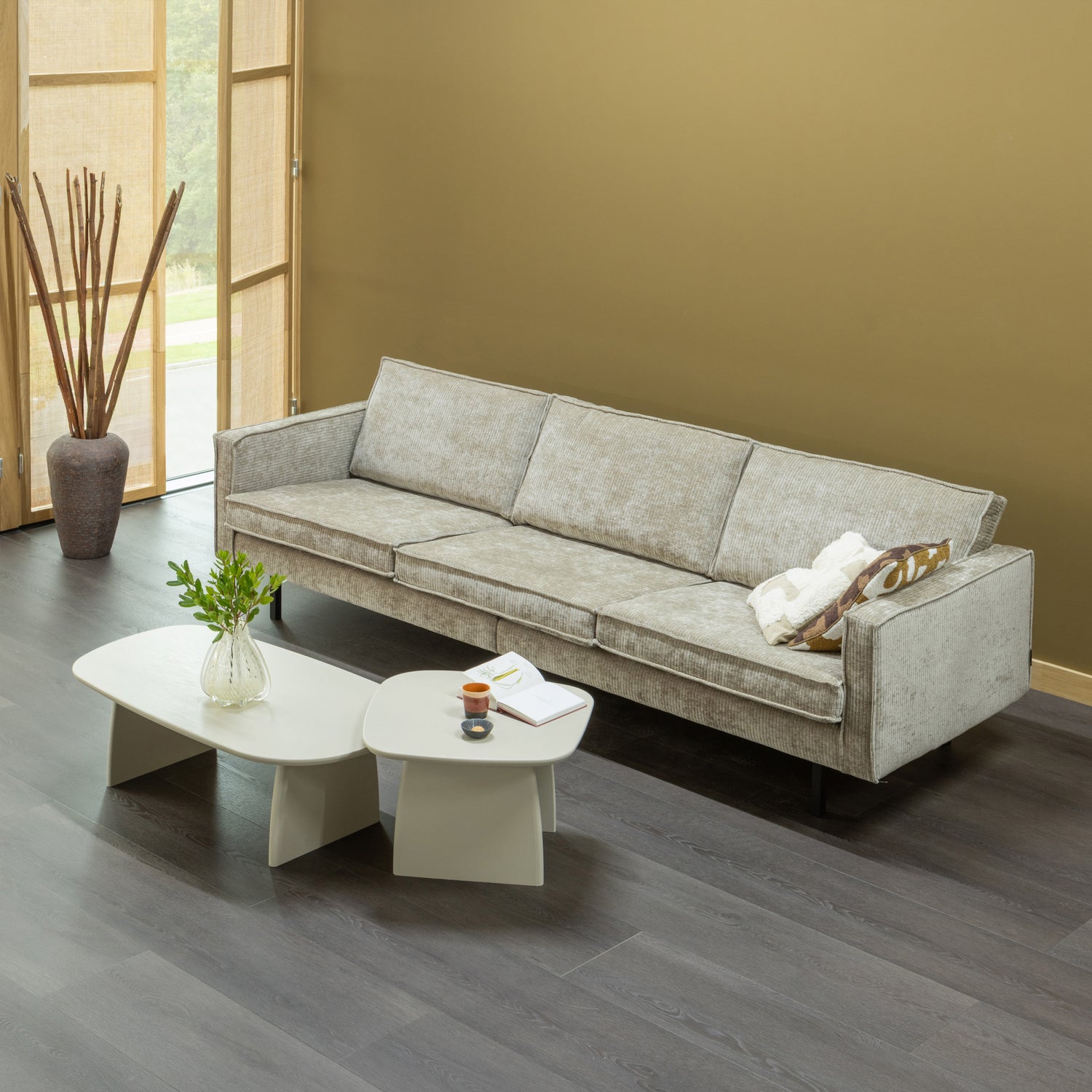 – Modern and contemporary design – Part of the well-known Rodeo series – Upholstered in luxurious ribbed fabric – H 85 cm x W 277 cm x D 86 cm The Rodeo series from Dutch interior label WOOOD is modern, sturdy and contemporary. The generous Rodeo chairs offer wonderfully firm seating comfort. Thanks to the high leg frame, the furniture looks slim and airy. Rodeo is known for its timeless colour and material combinations, inspired by the 1950s and translated into a contemporary design. Go for this luxurious ribbed fabric, for example. Dare to be you, dare to go Rodeo!